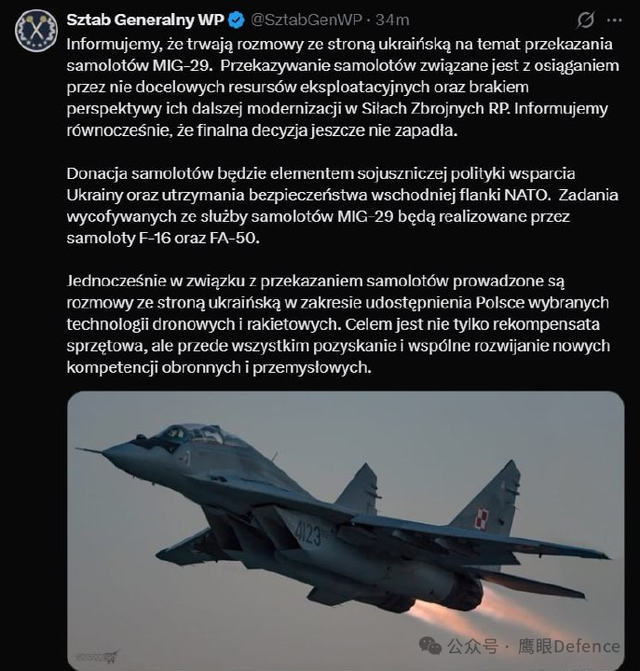 军援方面,最值得一提的,当属波兰 波兰武装部队总参谋部宣布,正在与乌克兰方面谈判,波兰准备向乌克兰提供剩余的全部米格-29战斗机,作为补偿,乌克兰则向波兰提供其已经实战检验过的部分无人机技术和导弹技术,“目的不仅是补偿设备,更重要的是获得并共同发展新的防御和工业能力”。