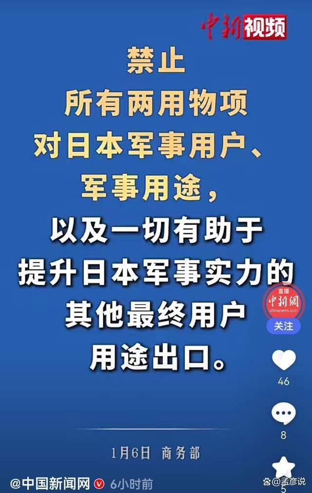 “两用物项”最严管制。1月6日,中国商务部发布公告,禁止所有两用物项向日本军事用户、军事用途及有助于提升其军事实力的最终用户出口,以维护国家安全和利益、履行防扩散等国际义务。